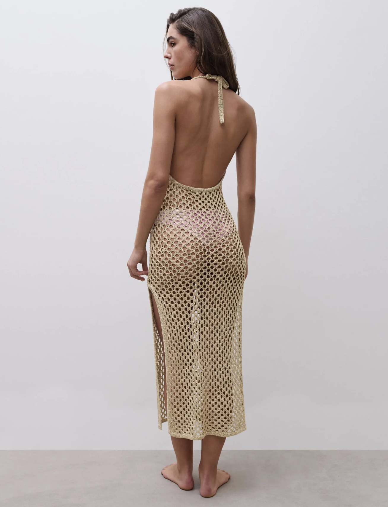 De Metallic-lijn van het merk Chantelle heeft een trendy en gedurfd silhouet. De diepe V-hals en mooie ronde uitgesneden detail onder de borsten geeft een sexy look. De jurk heeft een haltersluiting en kan in de nek vastgeknoopt worden. Middenvoor wordt afgewerkt door een gouden accessoire. De strandjurk is gemaakt van breed lurexgaas die subtiel glinstert in het zonlicht. Daarnaast bevat de jurk aan beide kanten een smaakvolle split. Combineer met je favoriete badmode en mooie slippers. Hiermee ben jij klaar om deze zomer te schitteren!