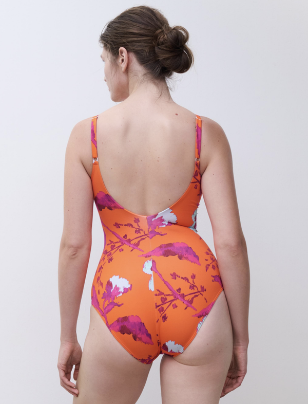 Steel de show op het strand of bij het zwembad met dit prachtige, kleurrijke badpak! De Icon lijn van Chantelle bestaat uit de klassieke en geliefde stijlen van het Chantelle merk. De felle contrasterende bloemenprint zorgt voor een fashion statement. Modieus en kleurrijk! Het bekende badpak van Chantelle is niet voorgevormd maar biedt de perfecte ondersteuning en comfort dankzij de onzichtbare beugels in het badpak. De cups zijn niet voorgevormd en hebben subtiele ruches aan de voorkant. De combinatie van een levendige oranje basiskleur en een opvallende paarse bloemenprint zorgt voor een trendy en zomerse uitstraling. De gouden accenten op de schouderbandjes geven het badpak een luxe touch, terwijl de flatterende pasvorm je natuurlijke vormen prachtig benadrukt.