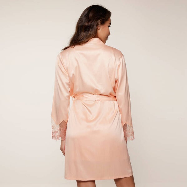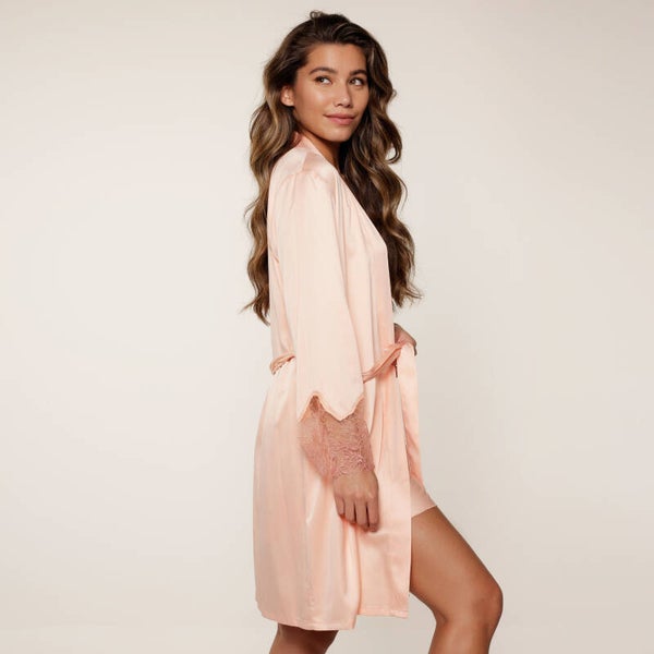 “Peach perfect: sweet, stylish, and a little cheeky!”De satijnen kimono heeft een mooie lengte. De mouwuiteinden zijn afgewerkt met mesh en embroidery. Je kunt de ceintuur gebruiken om de kimono naar wens te tailleren.