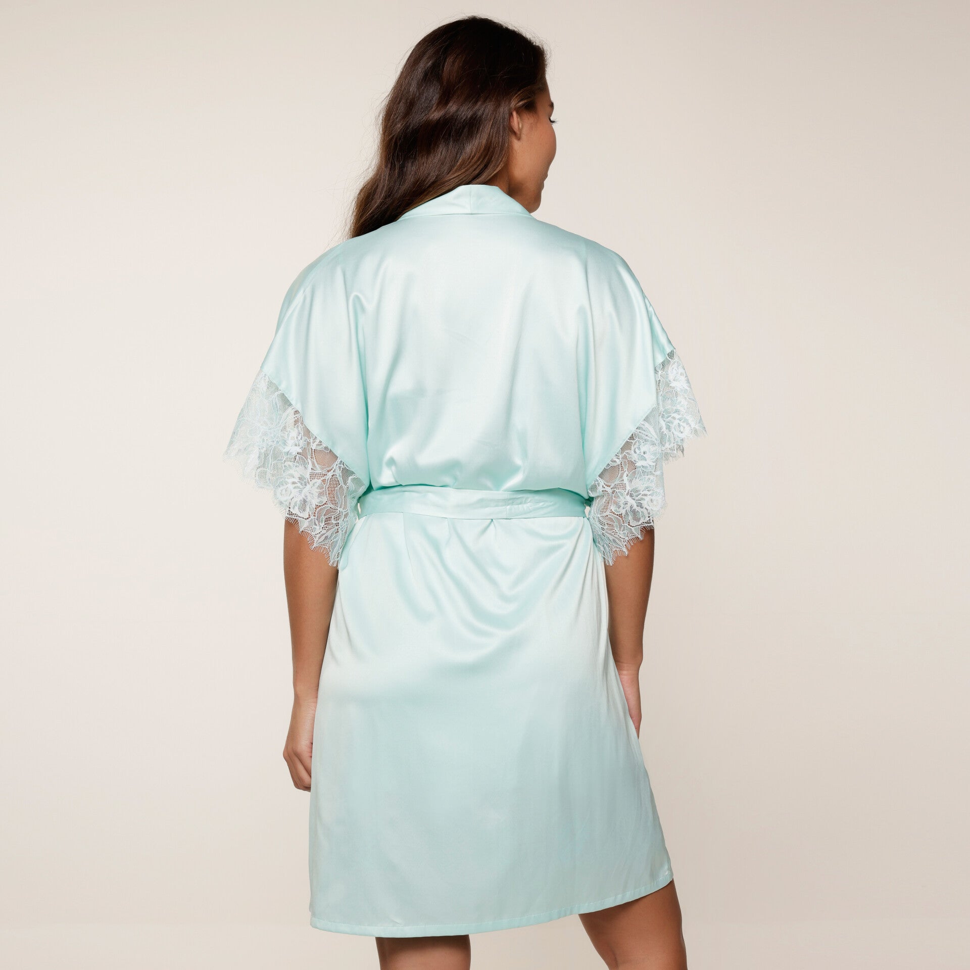 “Jade Blue: serenity with a touch of elegance.” De satijnen kimono heeft een mooie lengte. De mouwuiteinden zijn afgewerkt met mesh en embroidery. Je kunt de ceintuur gebruiken om de kimono naar wens te tailleren.