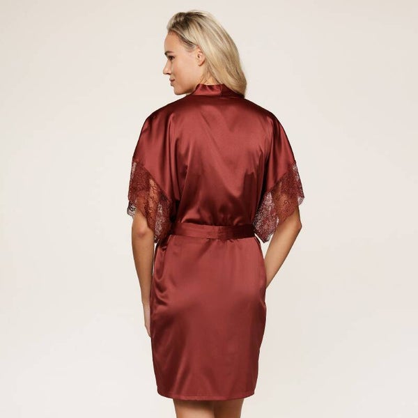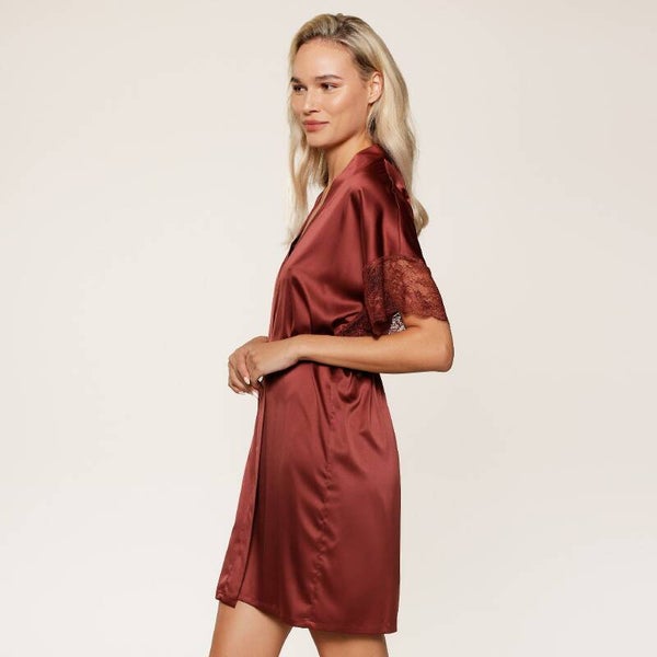 Beautiful Bordeaux! Deze elegante, satijnen kimono heeft wijde korte mouwen die mooi zijn afgezet met kant De kimono kan met een koordje aan de binnenkant vastgeknoopt worden en met een centuur rond het middel.